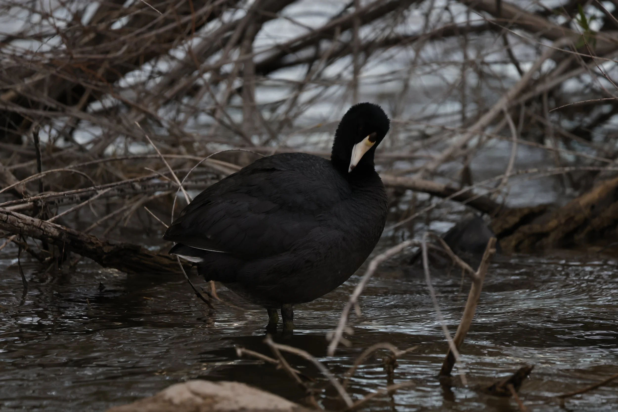 I think this is called an American Coot! Really hard to photograph without it turning into a black blob, almost its entire body is pure black.