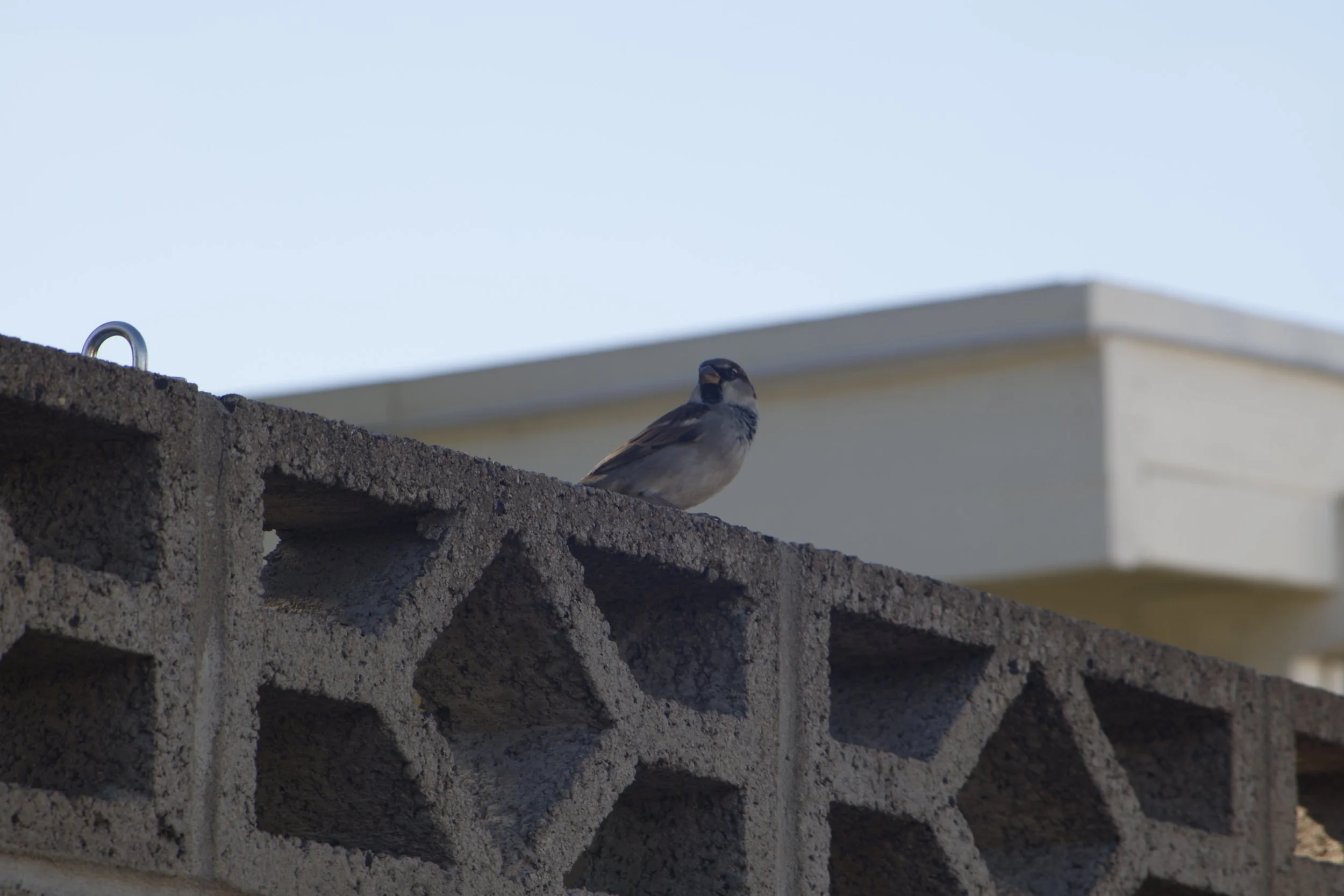 While standing against the wall to be out of the sun a bird landed directly above my head and terrified us both.