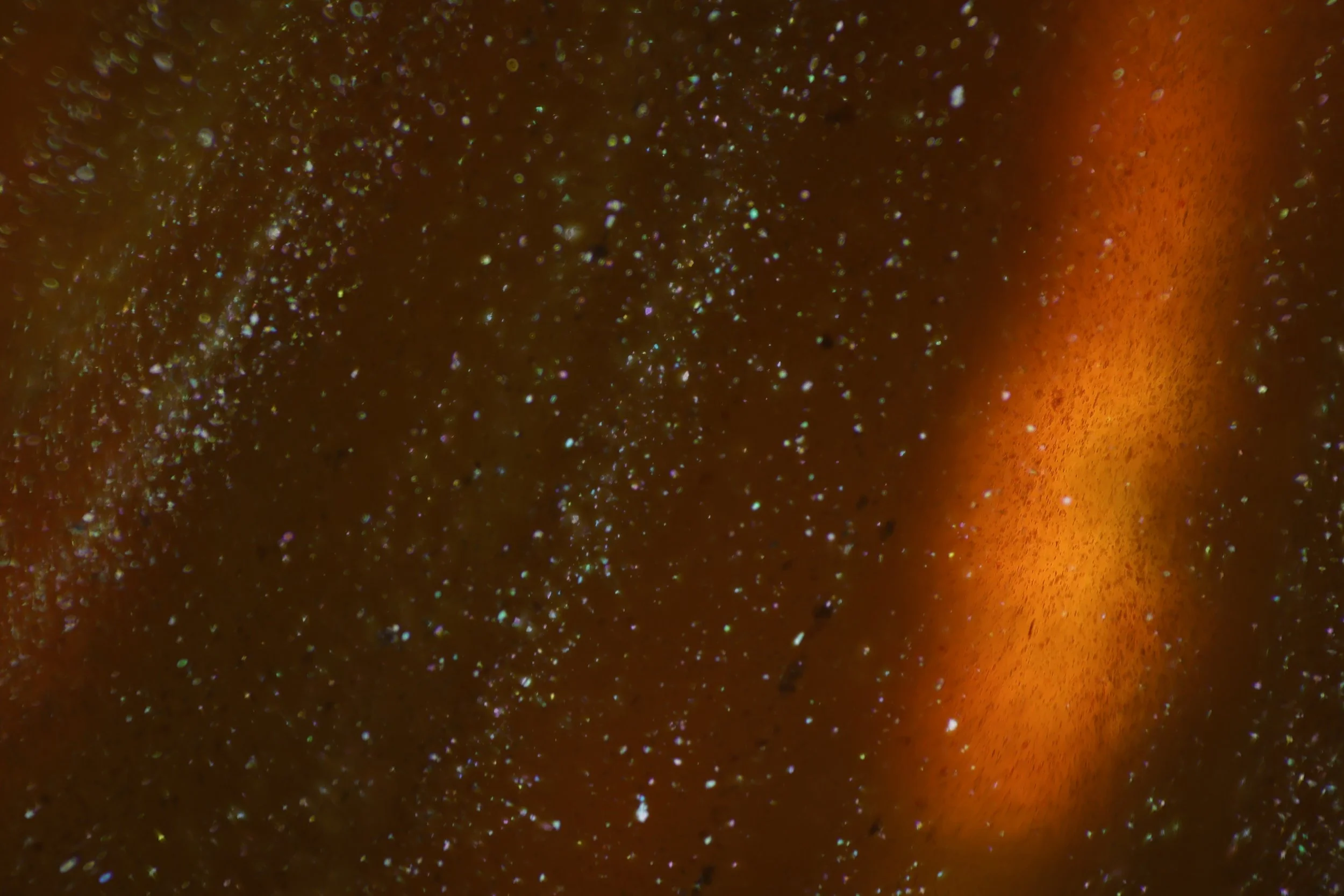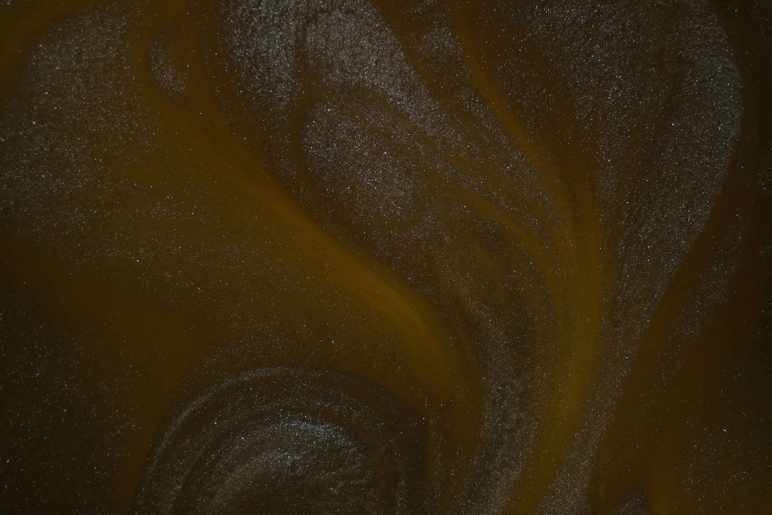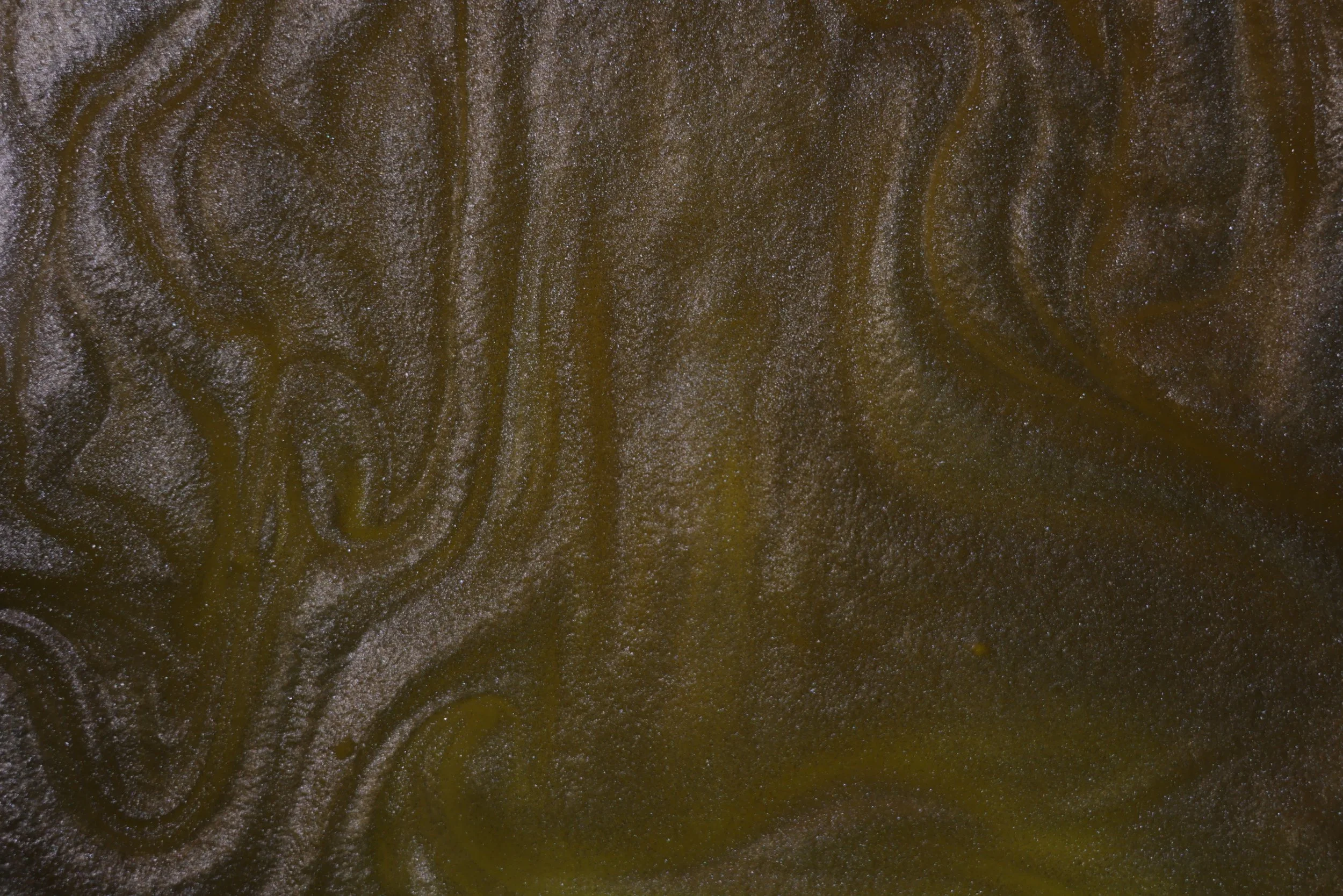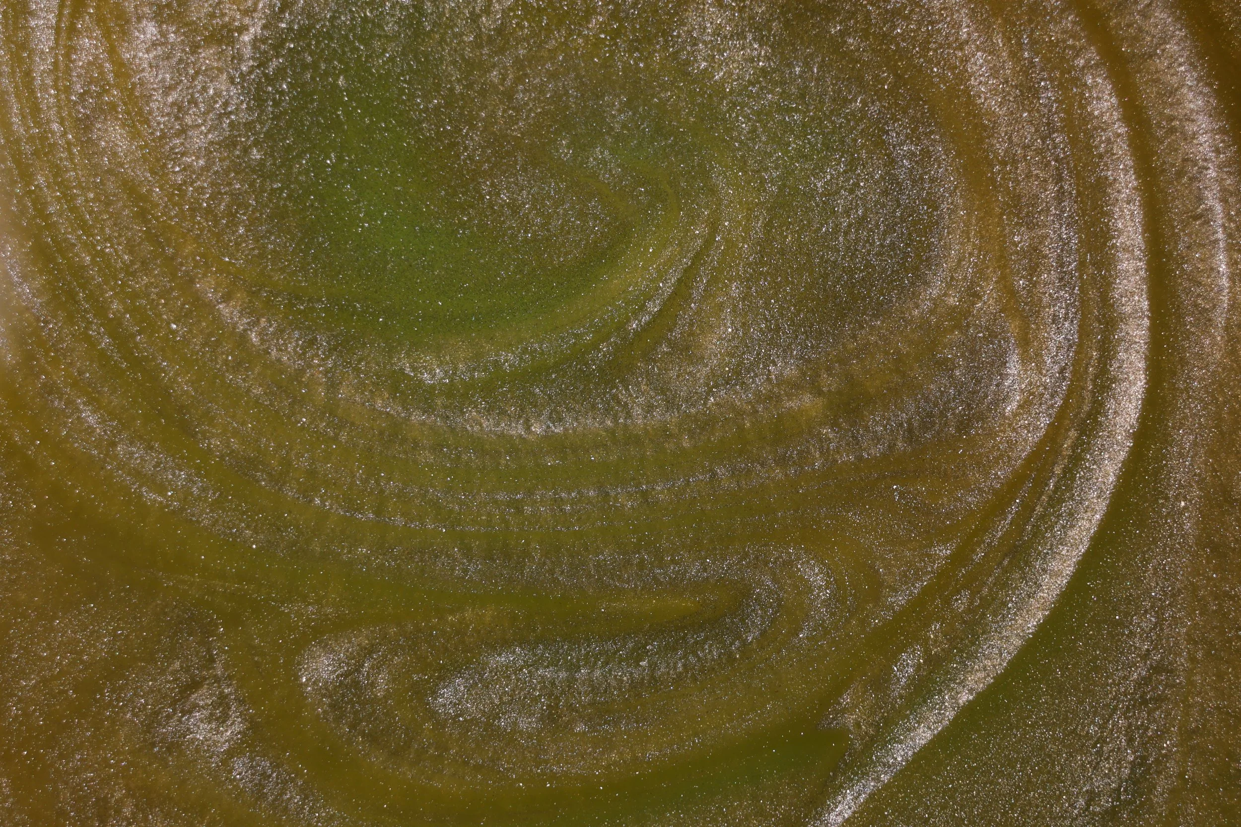 When white mica powder is added to oil it creates a very reflective surface as well as displaying convection patterns.