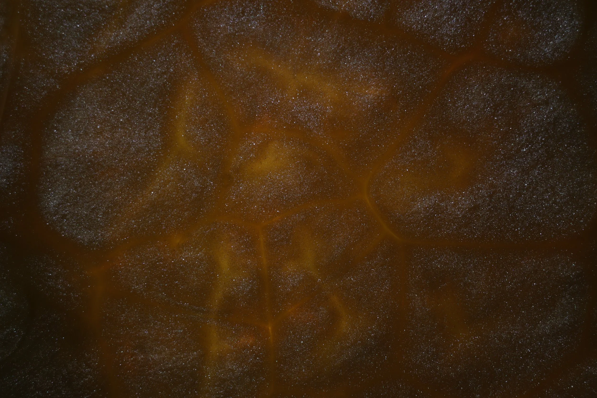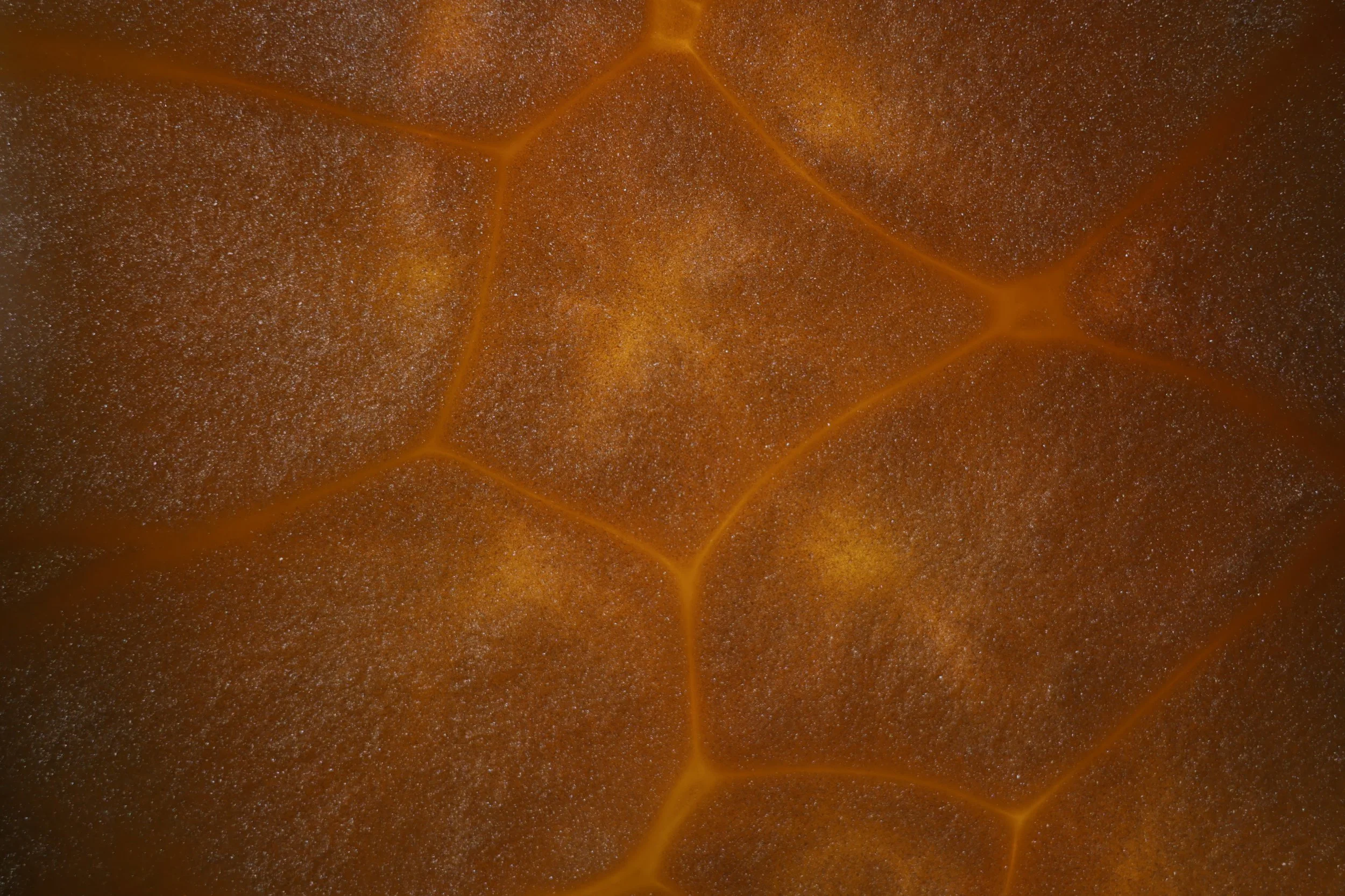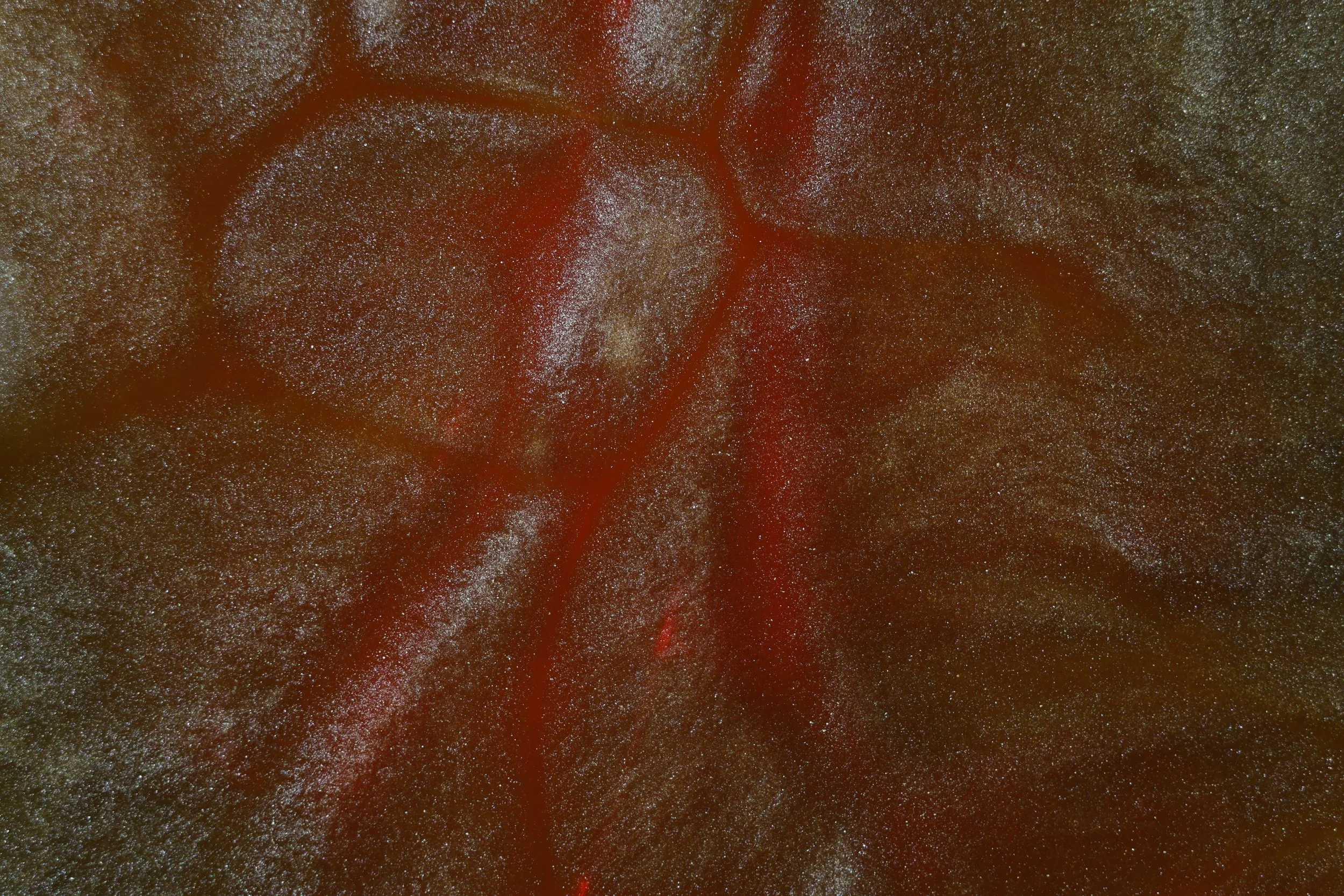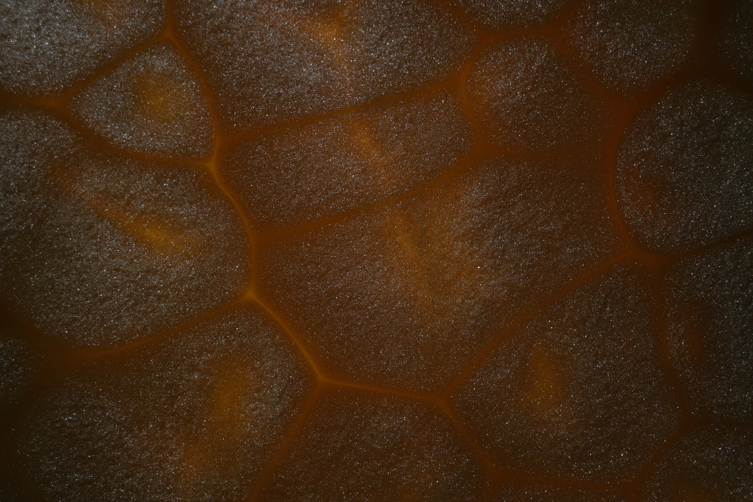 This image showcases a pattern known as convection cells, a similar pattern can be seen on the surface of the sun. This is caused by the heat produced from the light below the oil creating small hotspots allowing the oils density to change in certain spots, the suspended mica powder flows at a different rate from the oil creating the easily visible separations.