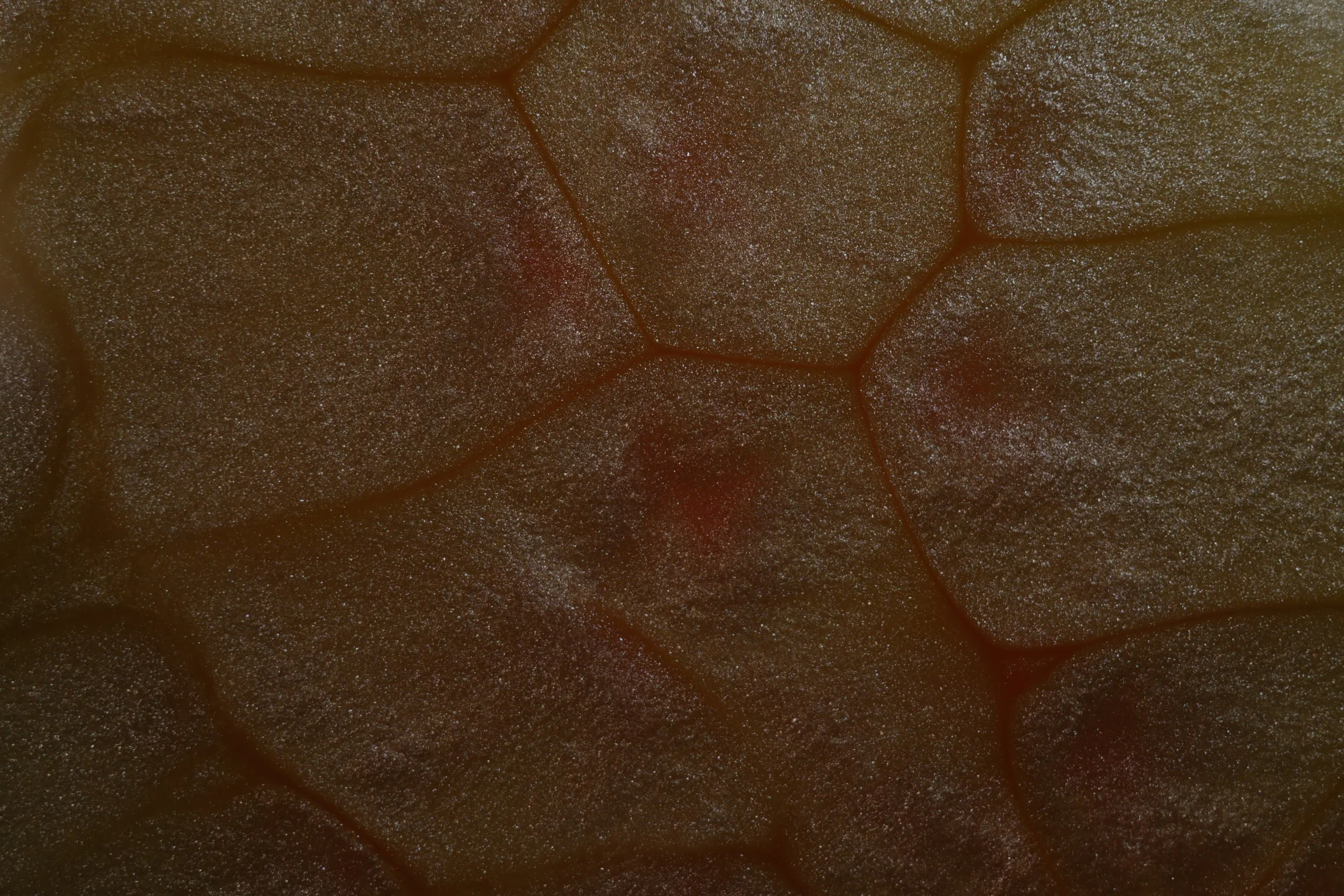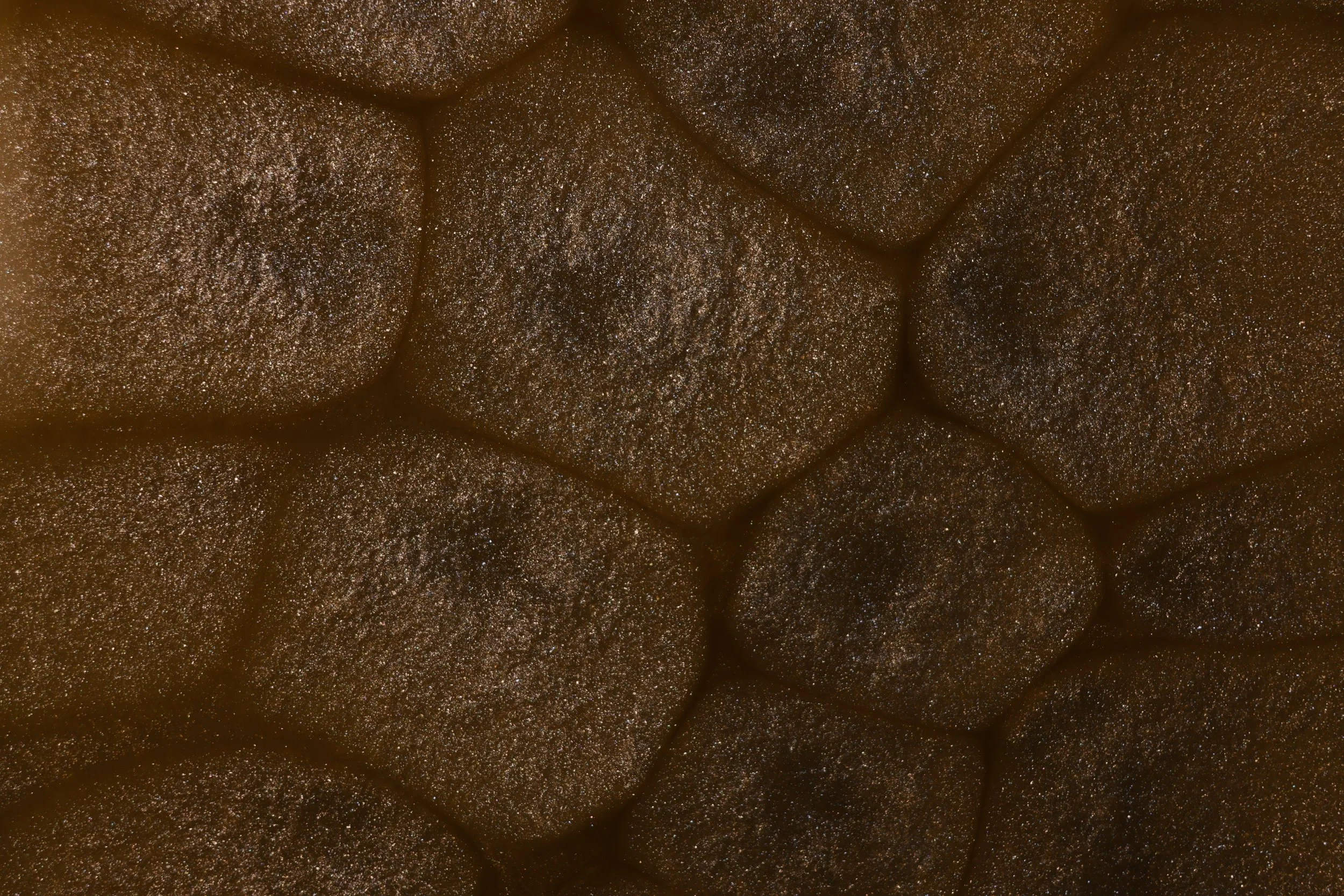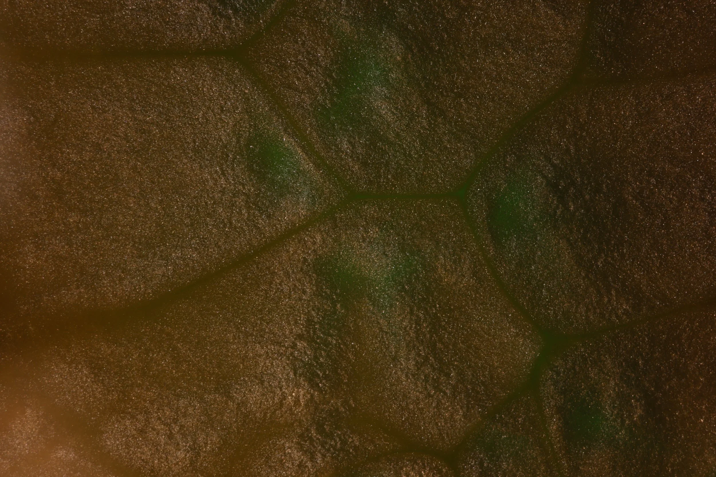This image showcases a pattern known as convection cells, a similar pattern can be seen on the surface of the sun. This is caused by the heat produced from the light below the oil creating small hotspots allowing the oils density to change in certain spots, the suspended mica powder flows at a different rate from the oil creating the easily visible separations.