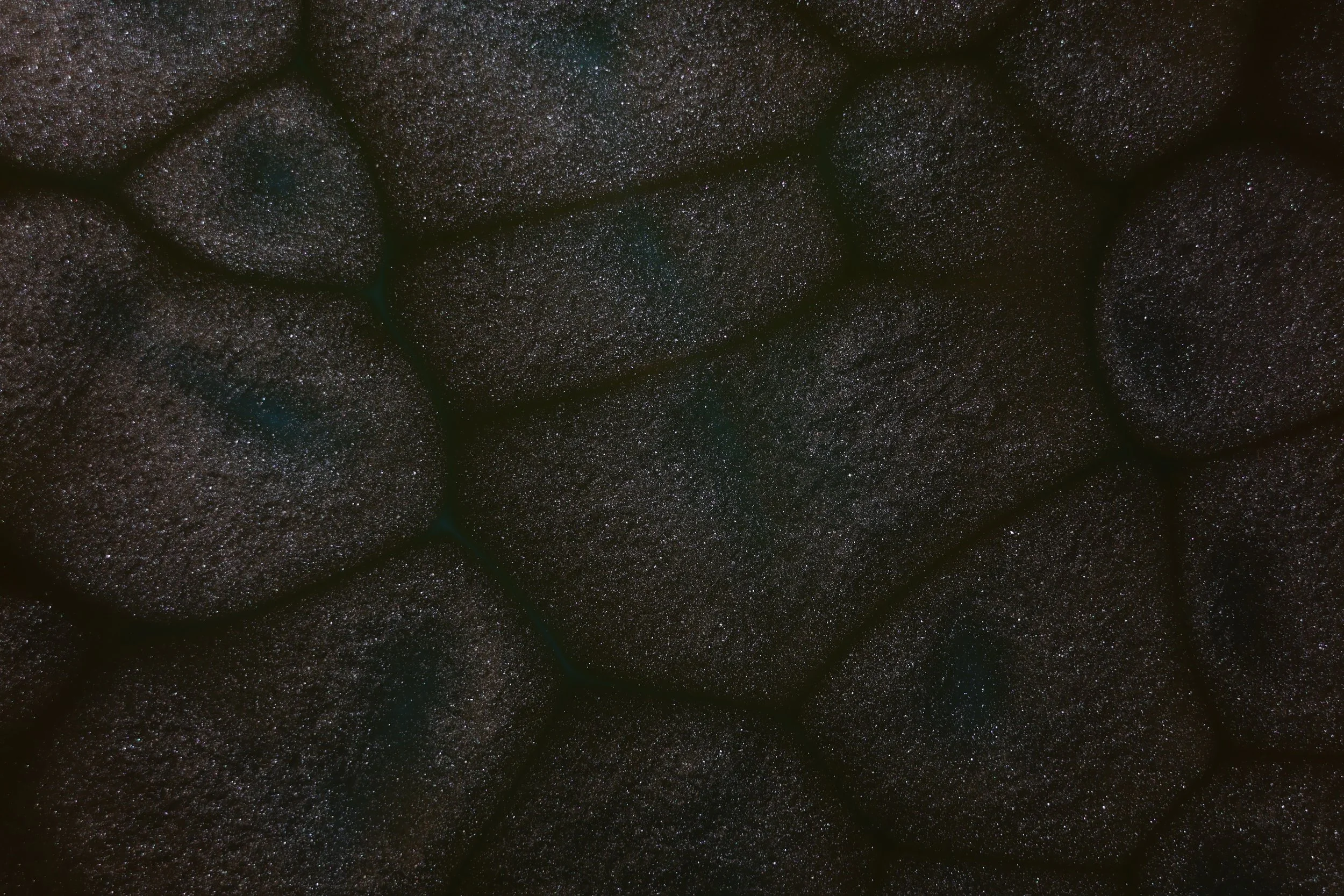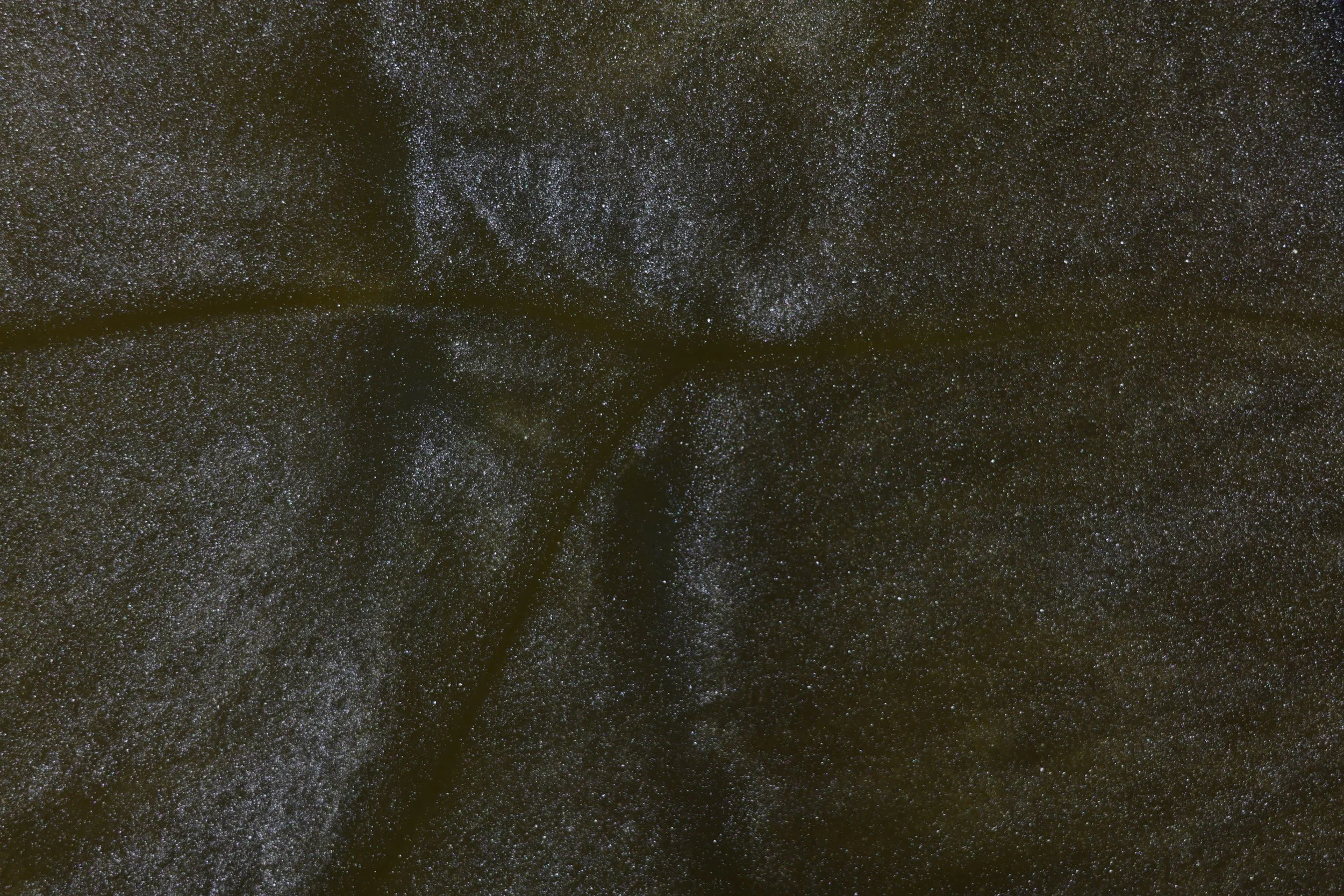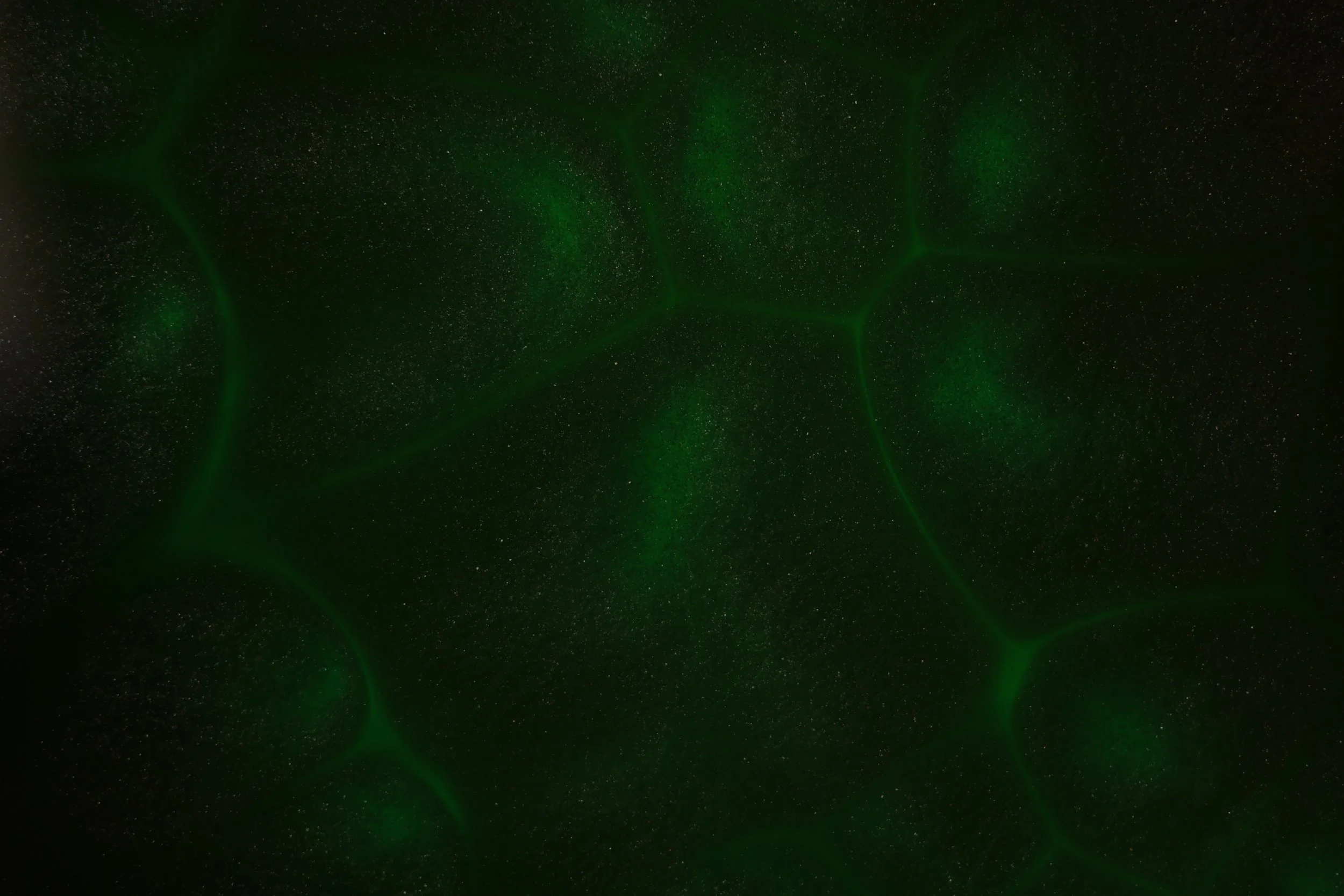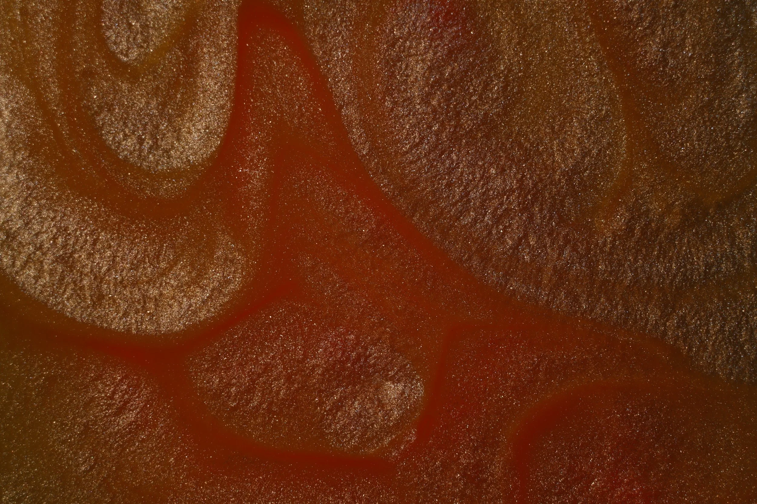 This image showcases a pattern known as convection cells, a similar pattern can be seen on the surface of the sun. This is caused by the heat produced from the light below the oil creating small hotspots allowing the oils density to change in certain spots, the suspended mica powder flows at a different rate from the oil creating the easily visible separations.